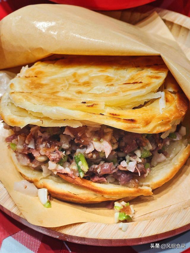 御膳房厨师抓瞎,和面没油酥,偶而应变用卤肉汤油代替,烙出的饼夹上精肉呈上去。