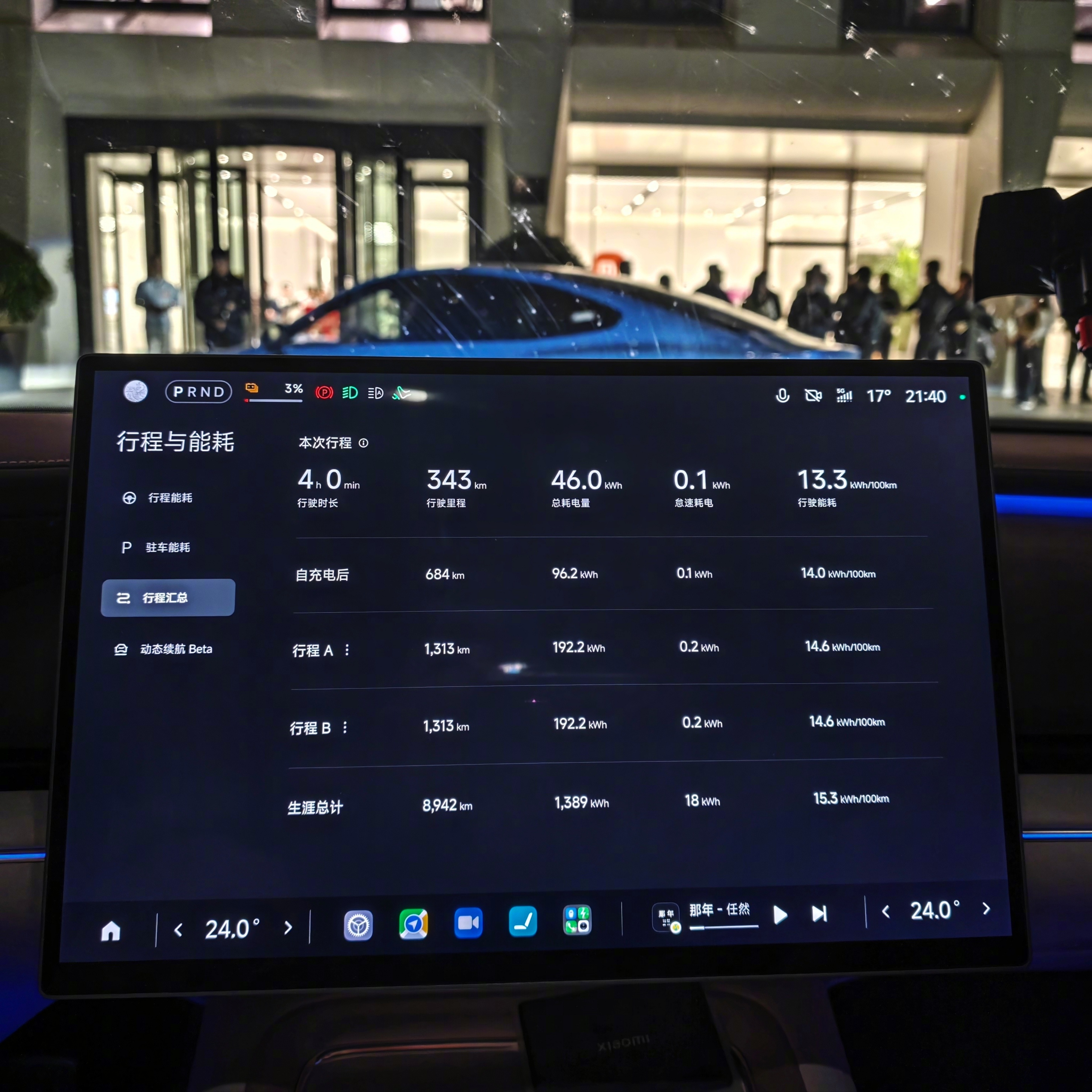 从最终的数据发挥来看,这辆车在搭乘雷军等三名成年男性并佩戴多数照相设置的条目下,实质行驶1313公里,剩余续航3%,平均能耗定格在每100公里14.6kW/h。