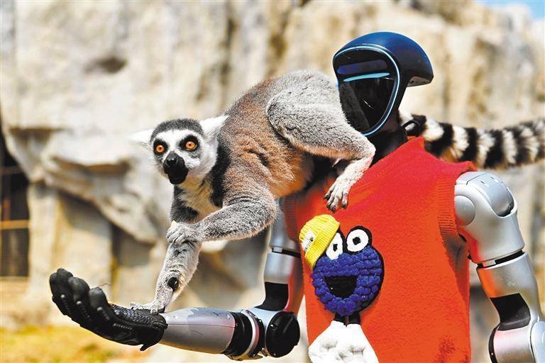 3月21日,山东省青岛丛林野纯真物寰宇,机器东说念主“饲养员”在给环尾狐猴喂食。俞方平摄(中经视觉)
