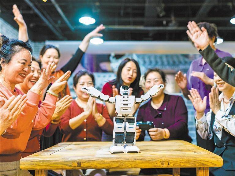 3月12日,市民在内蒙古呼和浩特市玉泉区老年大学智能愚弄课上与机器东说念主互动。丁根厚摄(中经视觉)
