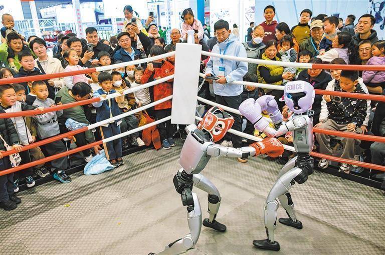 3月14日,安徽省2026合肥外洋工业自动化暨机器东说念主博览会现场,不雅众在不雅看东说念主形机器东说念主拳击比赛。何 玉摄(中经视觉)