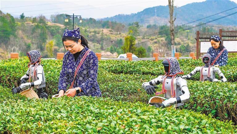 三月二十二日,湖北省黄冈市英山县乌云山村的茶园里,机器东说念主与茶农一同采摘春茶。王 江摄(中经视觉)