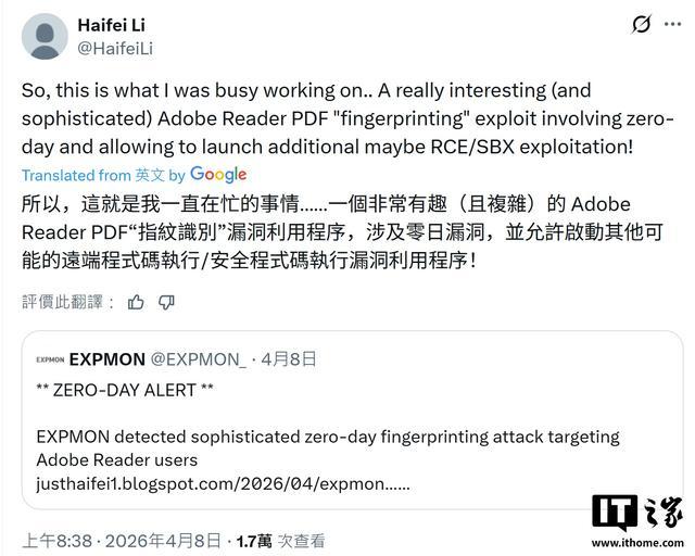 Haifei Li 还是将干系情况通报给 Adobe,并提议用户在官方发布流毒建筑更新前,不要大开身分不解的 PDF 文献。