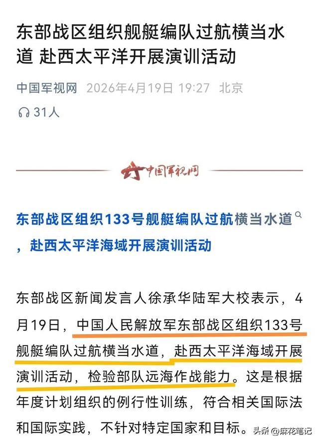 东部战区发布音信,4月19日,中国舟师133舰艇编队穿航横当水谈,投入西太平洋海域西宾。报谈称,这次算作把柄年度筹画组织的例行性西宾合适干系外洋法和外洋手艺,不针对特定国度和想法。